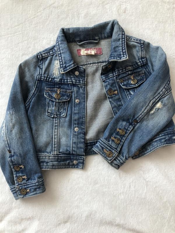 Стильная джинсовая куртка с потертостями. Рост 104, 3-4 года. Длина 29 см, длина рукава 36см, ПОГ 30 см.