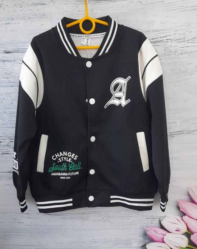 Бомбер поєднує в собі кофту та весняну куртку. Модель із двоколірною гумкою на манжетах, крайці та комірі. Застібається на кнопки, що робить цю модель дуже зручною. З боків - накладні кишені. Тканина якісна турецька трьохнитка. В наявності в двох кольорах: -чорний з білим, -зелений з білим.