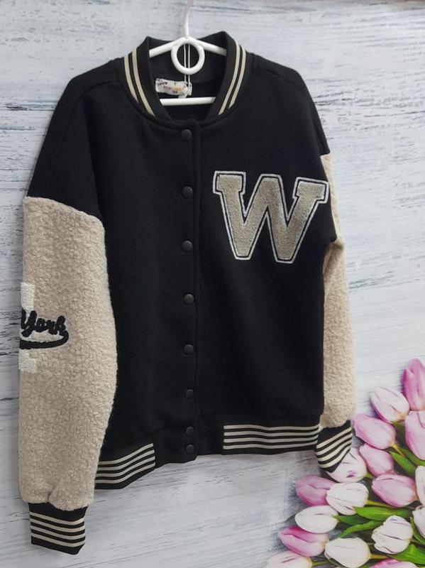 Бомбер поєднує в собі теплу кофту та весняну куртку. Модель із двоколірною гумкою на манжетах, крайці та комірі. Застібається на кнопки, що робить цю модель дуже зручною. З боків - накладні кишені. Тканина якісний турецький футер з начісом, рукави виконані з модної теплої тканини "кашка". В наявності в двох кольорах: -чорний з червоними рукавами, -чорний з рукавами кольору беж.
