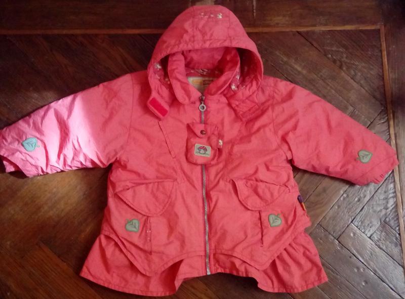 Оригинальная курточка, привезенная из Европы. Цвет коралловый (матовый) достаточно широк. Глибокий капюшон. Фасон "с бассочкой (юбочкой, рюшечком)", что очень нравится девушкам. По куртке пришиты светоотражающие листочки. Забавный карман на липучке поверх молнии. Куртка по низу внутри затягивается на резинку. Замеры: длина по центру спинки 54 см (с учетом баски), длина внутренней (утепленной) части по центру спинки 47 см. ширина 45 см. Смотритель мою Шафу - есть подарки / бонусы при покупке любой вещи 1:1 🎁