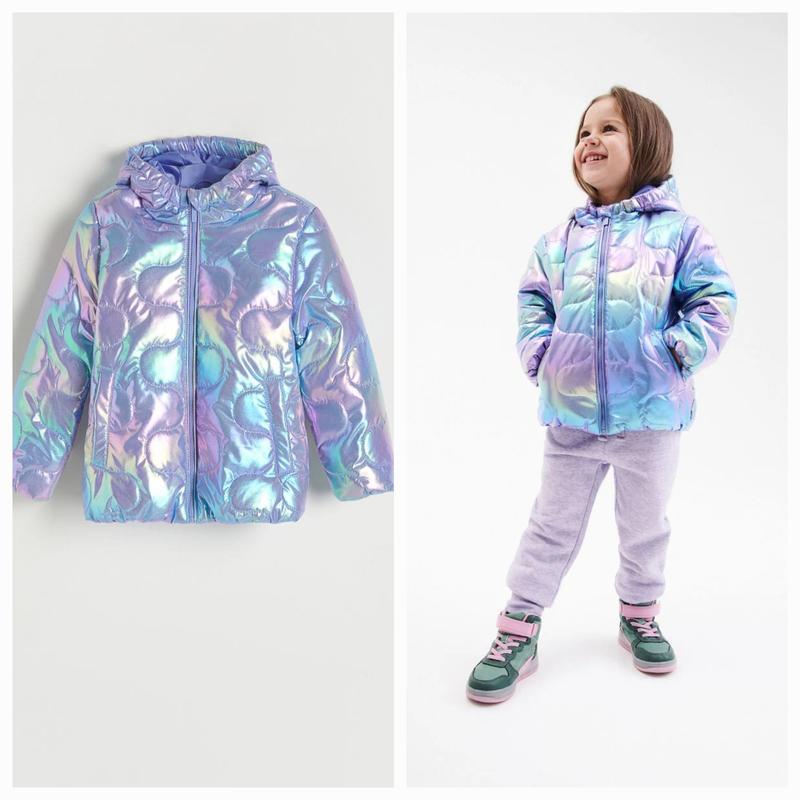 Блестящая куртка фирмы Reserved. Размер 3-4 года на рост 104см ПОТ - 35см, ширина между плечами - 29см, длина от плеча - 41см, длина рукава от плеча / от подмышки - 35/24см Куртка простого кроя из стеганой ткани с наполнителем из переработанных материалов. воротник-стойка застежка на молнию длинные рукава с оформленными резинкой манжетами два кармана спереди