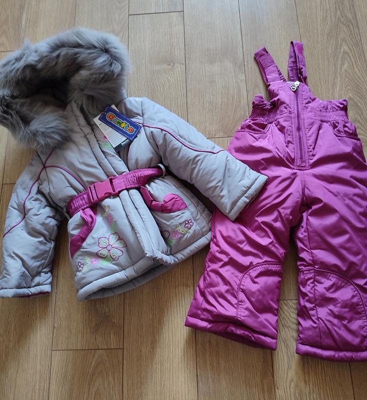 Комплект зимовий для дівчинки куртка, напівкомбінезон. Виробник: Donilo Розміри: 80, 86 см Наповнювач: хлорофайбер, підкладка — фліс, На рукавах і штанах є манжетики для збереження тепла.Міх натуральний. Штани-напівкомбінезон, довжина якого регулюється застібками на липучках.