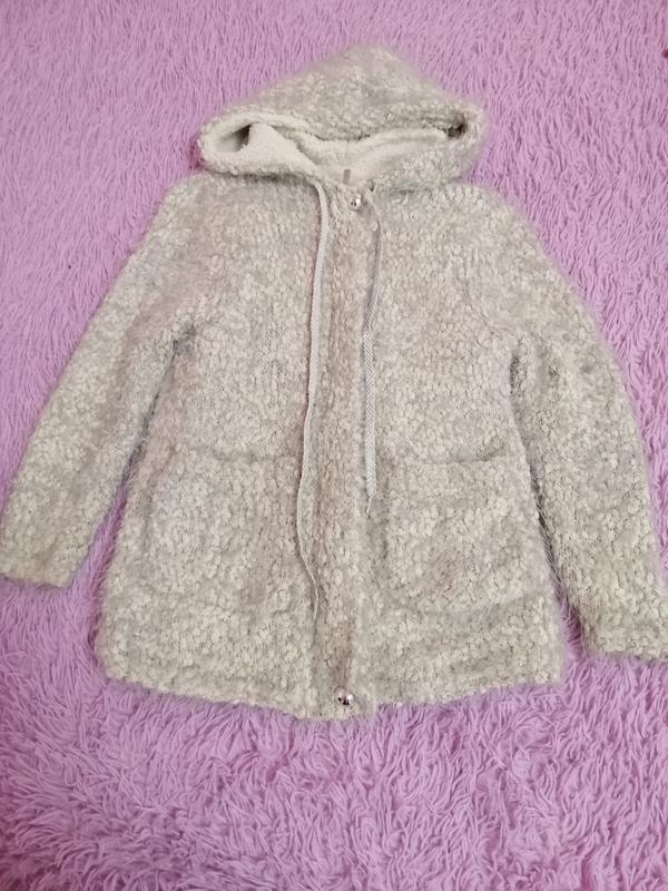 Очень теплый кардиган-пальто. Состояние отличное, без дефектов. На рост 130-146 носили.Мягкий и очень хорошо тянется и садится по фигуре. Замеры: Длина 58 Рукав52 Плечи33 Ширина40