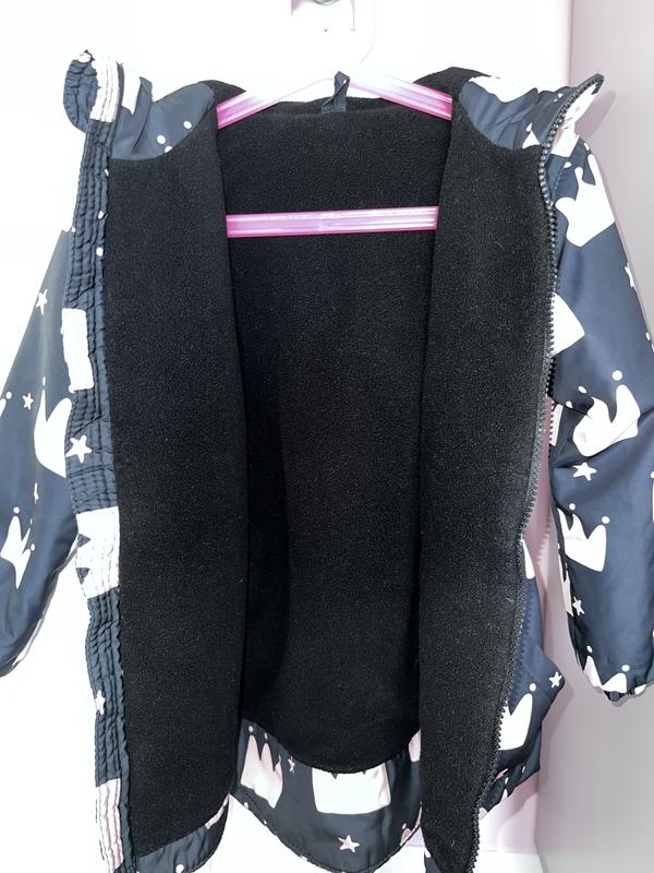Легкая куртка на флисе, верх водоотталкивающая ткань, приятная на ощупь. Грязь вытирается быстро влажной салфеткой. Красиво сидит на любимой малышке, талия фиксируется на резинке, очень удобна к любимой одежде. На курице указан размер 122, но реально на 116. Замеры Длина сзади - 55, спереди - 51 см Рукав- 39 см Полуобъем под руками - 39 Куртка имеет удобные кармашки и капишон.