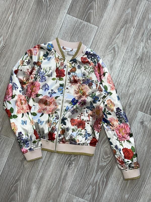Цветочный бомбер из атласной ткани Подкладка полиестер Есть карманы Состояние идеальное 🏷️H&M 11-12 лет/152 Длина 53. ПОГ 45. Рукав от шеи 68