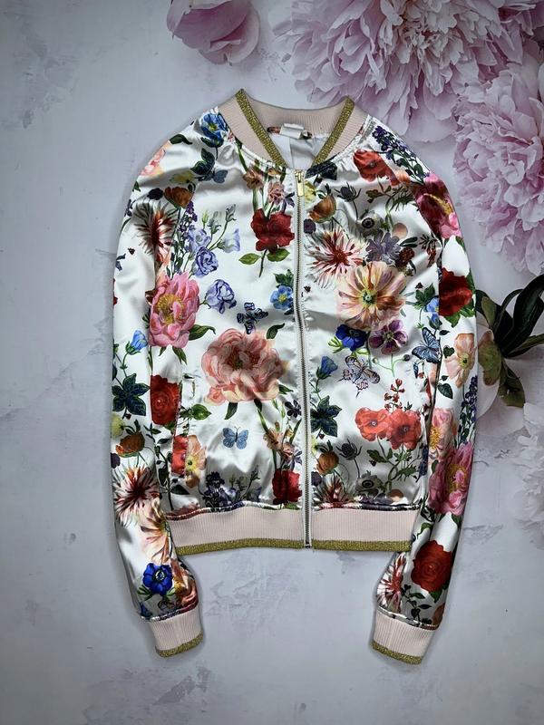 Квітковий бомбер з атласної тканини Підкладка поліестер Є кишені Стан ідеальний 🏷️H&M 11-12 лет/152 Довжина 53. ПОГ 45. Рукав від шиї 68