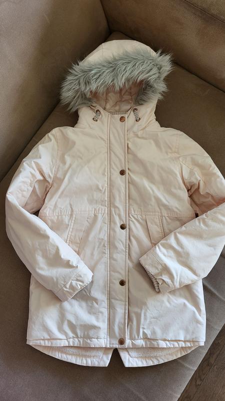 Нежно персиковый цвет Плотная внешняя ткань, устойчивая к ветру и воде. Задняя часть длиннее, внутри есть регулировка на поясе. размер 9-10 лет Идеальна на холодную погоду.