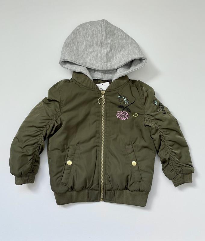 Стильная куртка бомбер демисезон от H&M. Капюшон на кнопках. По наборке размер 104, но немного маломерит. Замеры: длина - 40 см ширина - 35 см рукав+плече - 39 см