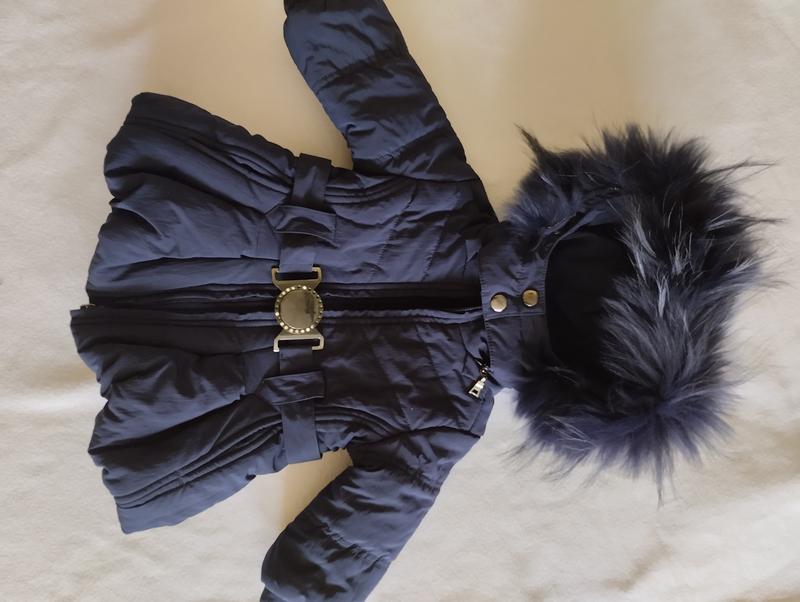Курточка на 1-1,5 рочков, наполнитель синтепон, подойдет на холодную осень или теплую зиму. Капишон фиксируется на замок, мех снимается. Имеет один дефект, выпало несколько камушек на поясе, на фото видно.