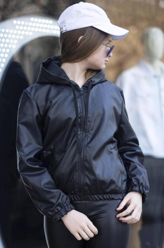 №2189 Розміри 140-146,146-152,152-158,158-164 Бомбер підлітковий Тканина — турецька екошкіра високої якості Рукави та низ куртки на гумці, капюшон затягується на шнурок Куртка на підкладці Колір —чорний