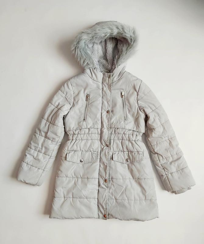 Теплая стеганая куртка удлинена на девочку 9-10 лет. Внутри- искусственный мех, наружу- плащевка. Рукава внутри на манжете. Застегивается на молнию и кнопки. Цвет - светло голубой Замеры: ширина плечей 37 см ширина груди 42 см длина рукава 54 см длина изделия 71 см