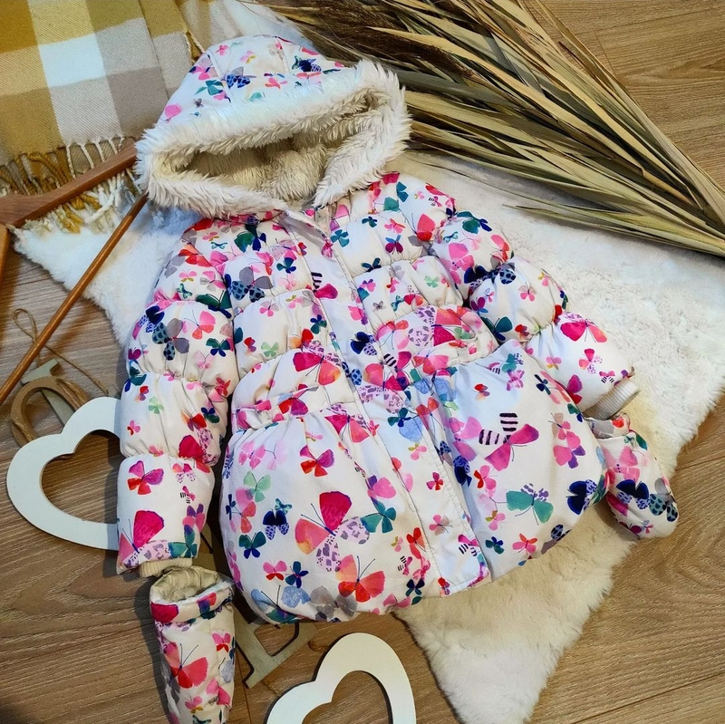 Красивенная качественная зимняя куртка Marks and Spencer. состояние идеальное, курточка удлиненная. Варежки пристёгиваются. Снаружи водоотталкивающая ткань, внутри на синтепоне и мягкой плюшевой подкладке. Размер указан 2-3 года на рост 98 см. Замеры: Длина от плеча до низа 47 Ширина под ручками 34 Рукав от плеча 35