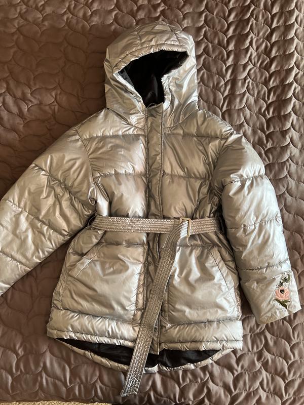Курточка зимняя, застежка закрыта дополнительно планкой ( на кнопках), капюшон цельный, перчатки пристегиваются на пуговицы. Все целое. Шапочка зимова в подарунок