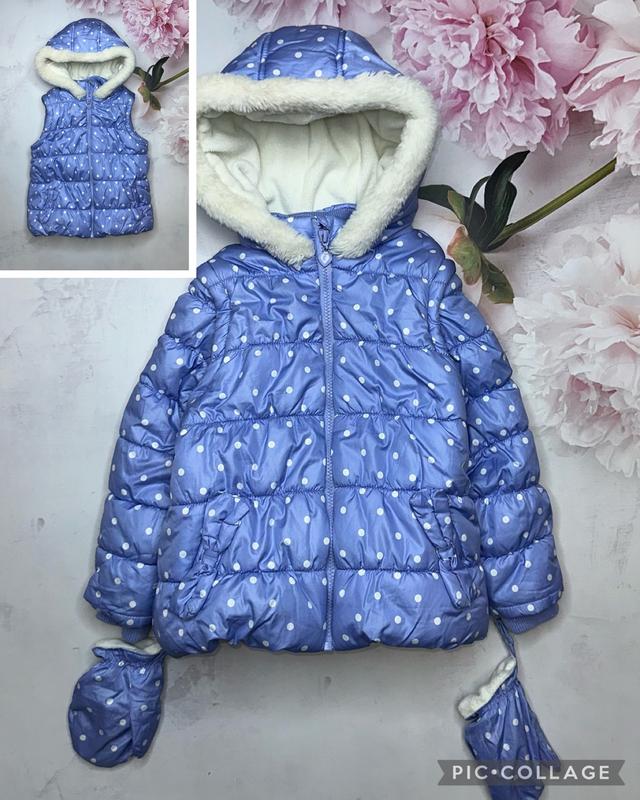 зимняя куртка/ жилетка на флисе с варежками. состояние отличное, при желании куртку можно сделать жилеткой!отстёгиваются рукава.высокий ворот,защита подбородка 4-5 лет George длина 45. ПОГ 35+. рукав 38-40