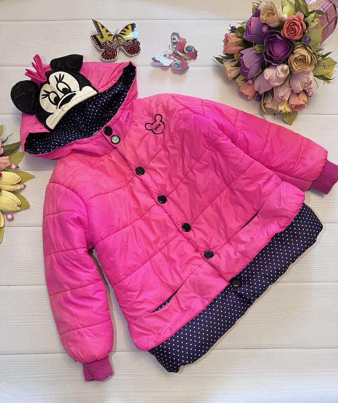 Демисезонная утепленная травкой и синтепон куртка на девочку, холодная весна-осень. На кнопках, с принтом Микки. Из недостатков подлилась верхняя ткань и есть маленькие бутылки (добавила фото 3 и 5 ) Замеры: длина -46 см, рукав от плечевого шва с манжетом -35 см плечо -7,5см пог - 41 см