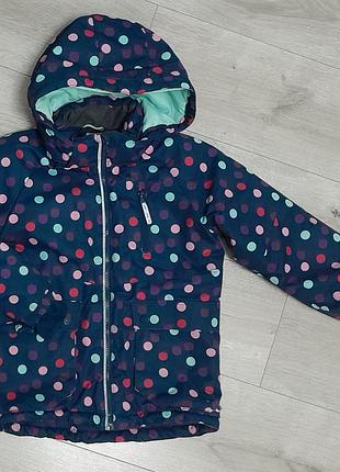 Дуже класна, тепла термо куртка з флісовим підкладом, знизу є резинка затяжка. Куртка після двох діток, є потертості на рукавах , дірочка на рукаві та кишені, в деяких місцях зашито власноруч. На вік 7-8 рокіа, вказано зріст 128см.