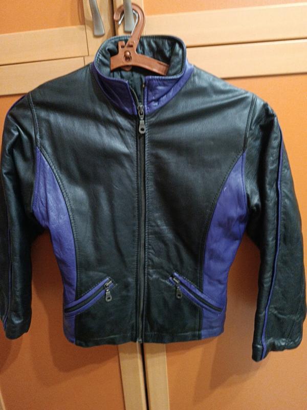 шкiра,колiр чорний та сиреневый , iз'яни на останньому фото, замiри: плечи 37, груди 40, талiя 36,низ ширина 38, довжина,51,рукав47