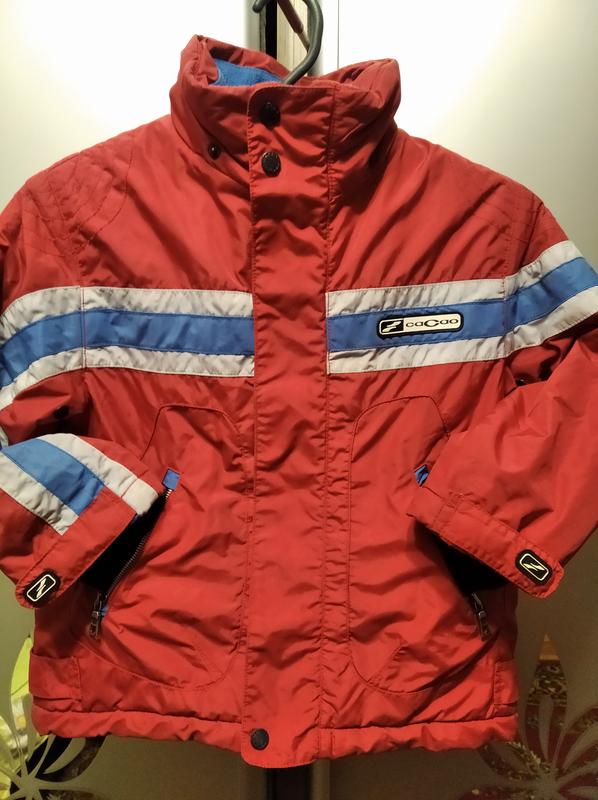 Теплая зимняя горнолыжная куртка на р.110-116 см.(без капишона). Тканина цупка, воздухонепроникна. Внутри есть дополнительная застежка с резинкой. На рукавах есть манжеты, которые можно отвернуть на всю длину руки. Длина 50 см, рукав 39 см. Ширина куртки внутри по спинке 44 см.