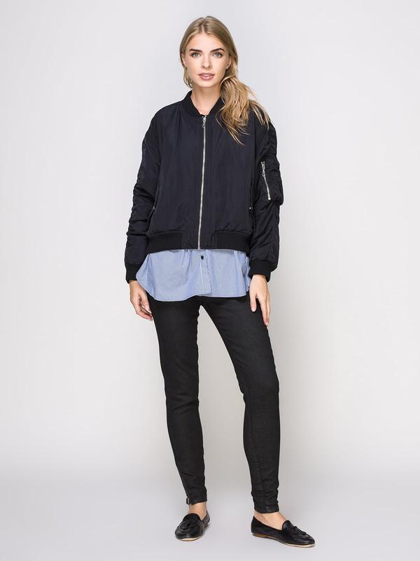 Описание товара Бомбер прямого силуэта из гладкой ткани. Модель с небольшим воротником-стойкой и застежкой-молнией. Длинный рукав и низ на манжетах. На полочках и рукавах - прорезные карманы на молниях. В идеальном состоянии, очень красивая модель на теплую весну, или лето.