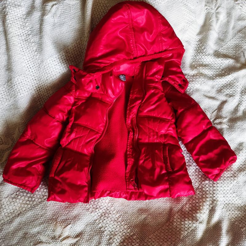 Стильная куртка на теплую зиму, холодную весну/осень с капюшоном. Цвет красный (вишня). не такой яркий как на фото. Длина по спинке 39 см. Больше подойдет для девочки около 2х лет
