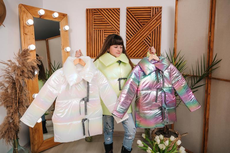 Колір: фіолетовий хамелеон; Розміри:146,152; Застібається на замок, бантики декорні; Підкладка: трикотаж, нейлон; Заміри: 146 152 Рукав 52 54 56 Довжина 62 66 68 Плечі 34 35 36 ПОГ 42 44 46
