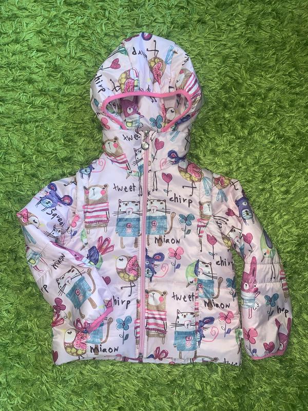 Очень практичная и удобная куртка-жилетка. Отстегиваются рукава и капюшон. Рисунок не маркий. Без дефектов. Заміри на фото.