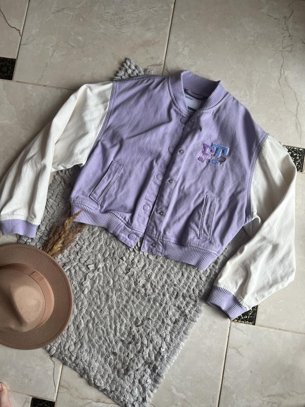 Ніжний бомбер в ліловому кольорі, стан ідеальний розмір вказаний хс Заміри довжина по спині 45,груди 54,рукав 55, Йде оверсай