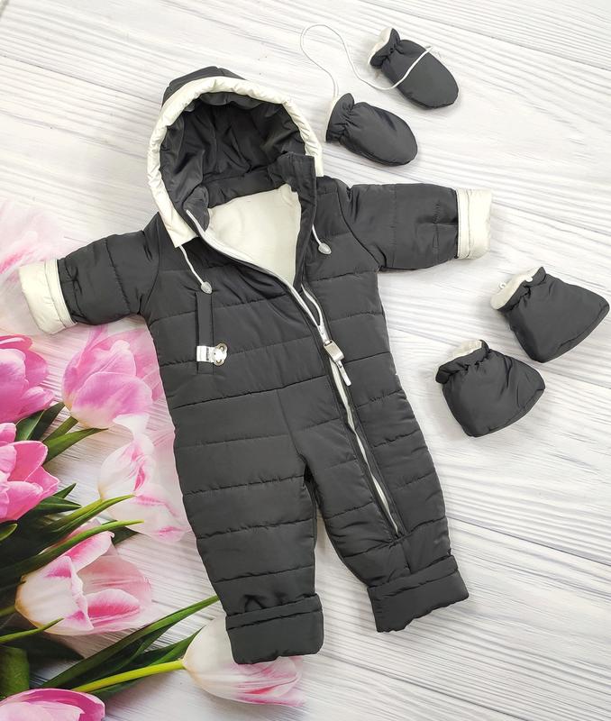 Демісезонні комбінезони весна-осінь Комбінезон із цілісним капюшоном Капюшон на двох затяжках Спереду застібається на блискавці по всій довжині на косу Блискавка захищена із внутрішнього боку спеціальною планкою Ручки та ніжки з відворотом Перчатки фіксовані на спеціальній лаштунці Топотушки фіксуються петельками - резиночками на ґудзичках Тканина - водовідштовхувальна мембрана Підкладка - фліс Утеплювач силіконізоване волокно 100мг Температурний режим від 0 до +16 Розмір 68, 74