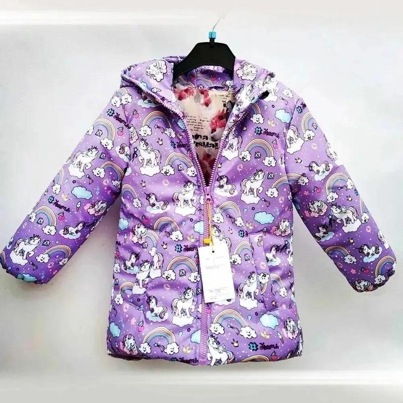 Курточка💣 "Единорог" 104-116 Розмір 104,116 Склад :плащівка принтована вітро/водонепроникна; -підкладка основи: 150 синтепон; - підкладка рукава та полочок нейлон; Кольор: бузьковий Спинка у куртці подовжена; Рукова на резинці; є бокові функціональні кішені для цукерок Капюшон не відстібається.
