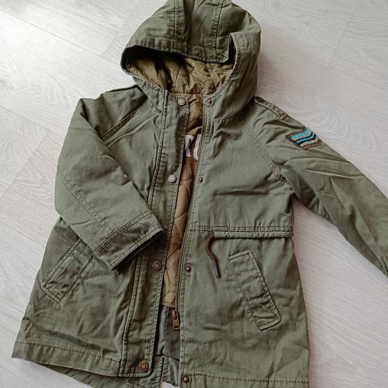 очень крутая и функциональная вещь, купила бы еще одну такую) парке коттоновая на тонкой подкладке к которой пристегивается курточка стёганая с надписью No Rules. носится всю весну и осень в зависимости от погоды пристегиваете, или отстегиваете, носите отдельно или вместе. Нам была супер комфортна Стан идеальных, без нюансов. размер 116, на фото одета с подвернутым рукавчиком, внутренняя курточка немножко короче имеет рукав.