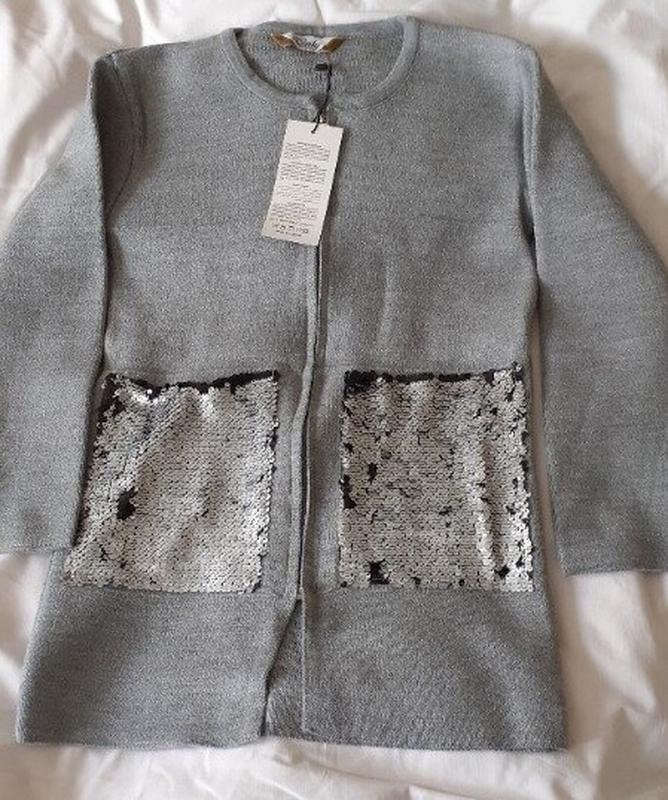 Виробник: Інший виробник Тип одягу: Інший тип одягу Розмір одягу: 10/140 Кілька примірників у наявності Кардиган на дівчинку на 9-10 років. На кишенях паєтки перевертиші