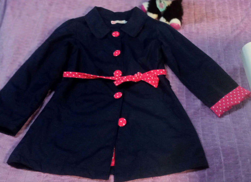 Тип одягу: Плащі Плащик дитячий. Темно-синього кольору, матеріал верху — плащівка, на тканинній підкладці малинного кольору в білий горошок. Розмір по бирці 130 см. Заміри: довжина 62 см. талія 76 см, довжина рукава 48 см у відкладеному стані (манжет можна регулювати). Пояс у комплекті. Стан ідеальний.