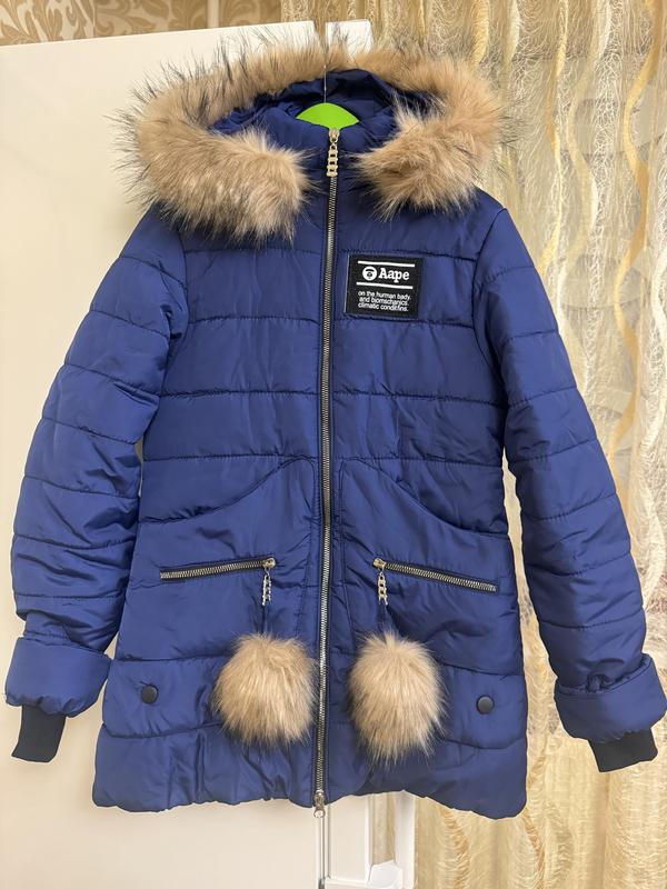 Зимняя курточка темно синего цвета на рост ребёнка 128 - 134 - 140 см , примерный возраст 8 - 9 лет , а может и на 10 лет подойдёт. Рукава можно подворачивать. Длина 68 см , в груди 42 см , в рукаве 58 см .