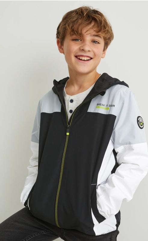 Куртка з легкої тканини з капюшоном, бічними прорізними кишенями та сітчастою підкладкою. Розміри: 128-164.