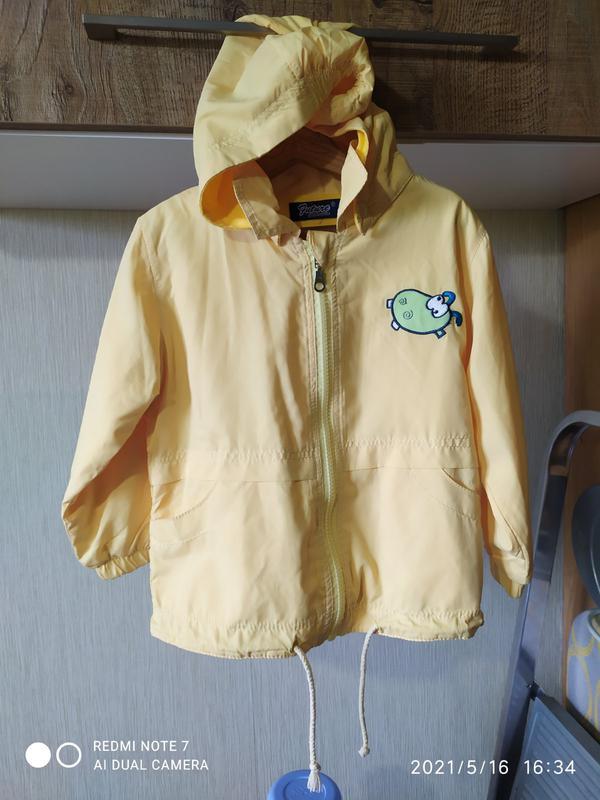 Куртка-вітровка, імпортна, Future Generation, з відстібним капюшоном, кишенями та великою кишенею-рюкзачком на спинці. Прикрашена аплікаціями. Матеріал: верх поліестер. Підкладка — трикотаж 100% котон. Рост 104. Нова. Заміри: • Довжина виробу — 43 см. ширина в плечах — 32 см ширина в пахвах — 40 см довжина рукава — 34 см