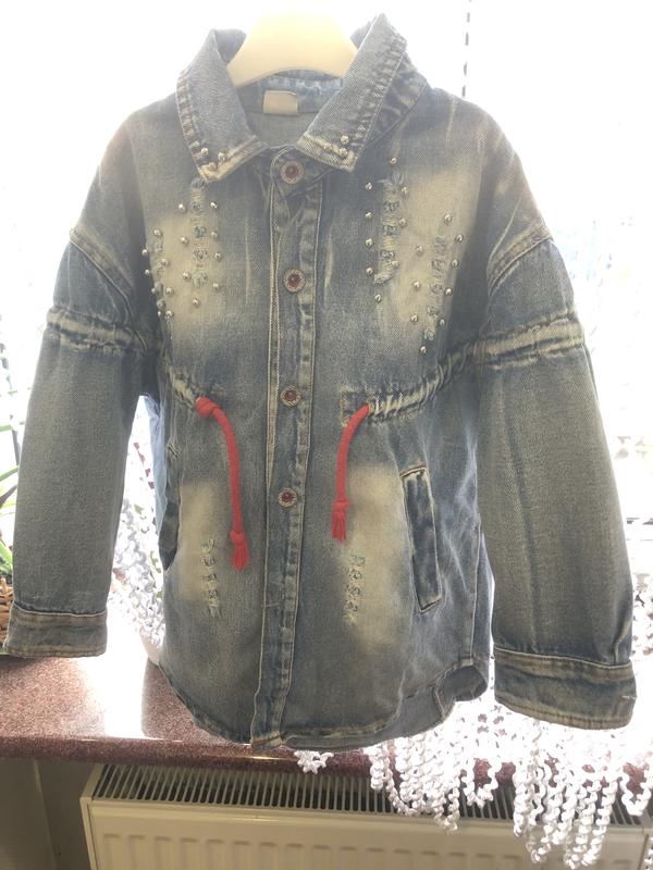 Дуже крута джинсова куртка,стан нової ,на ріст від 110 -до 122,може бути на дівчинку худеньку та пишненьку ,стягується ,