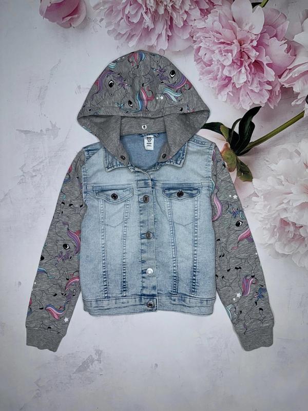 Джинсовая куртка с трикотажными рукавами и капюшоном Капюшон съемный Состояние идеал 🏷️H&M 7-8 лет/128 Длина 39. ПОГ 34. Рукав 45.