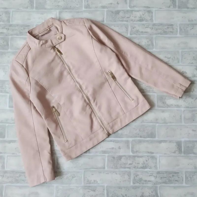 Пудровая курточка для девочки из экокожи. Размер 104/110. Есть небольшие дефекты, но они незаметны при носке (2 последних фото). Замеры: рукав 41 см., плечи 30 см., длина 43 см., ширина 35 см. На 5 фото готов образ (в объявлениях есть еще платье).