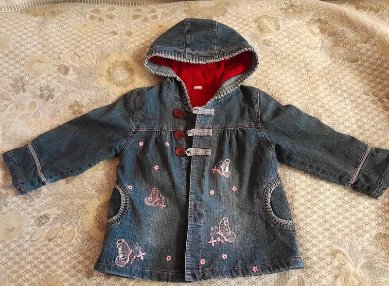 Джинсова куртка-плащ на флісі на дівчинку, на 110-116см. Заміри: Довжина 44, пог 36, плечі 30, рукав 37