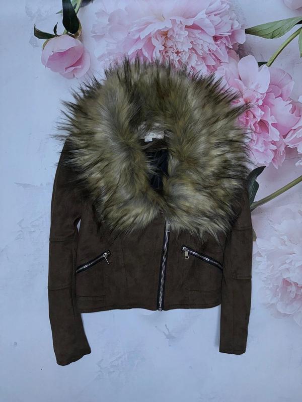 тканевая, под замш, курточка косуха, мех отстегивается. 9 лет River Island длина 43. ПОГ 44. рукав 48 (10 см плечо).