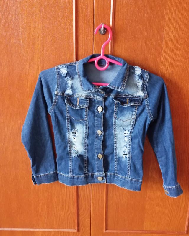 Джинсовая куртка на девочку темного синего цвета с потертостями. Состояние новой. Склад: 98% бавовна, 2% еластан. Размер 7/8 лет, 122/128 см.