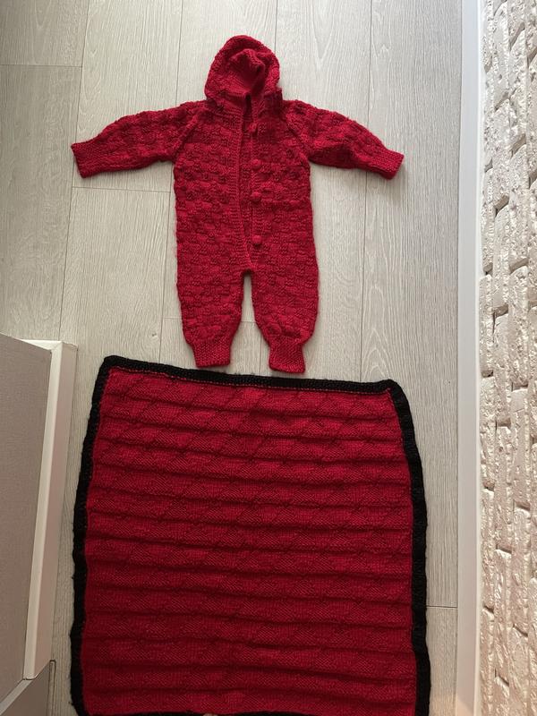Отличный комплект для коляски - комбинезон и плед. Замеры: - плед 60х60 см - комбинезон 54 см длина сверху вниз. На возраст около 2-5 месяцев Ручна вʼязка Чернигов самовывиз