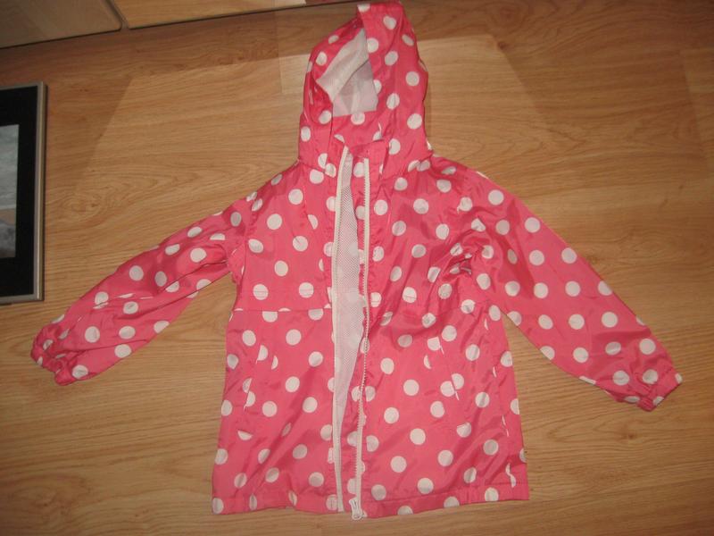 Яркая красивейшая ветровочка, смотрится обалденно, очень нравилась дочурке, внутри сеточка подкладка, длина 48см пог-38см плечи 30см рукав 41см, капюшон неснимается но прячется в воротник