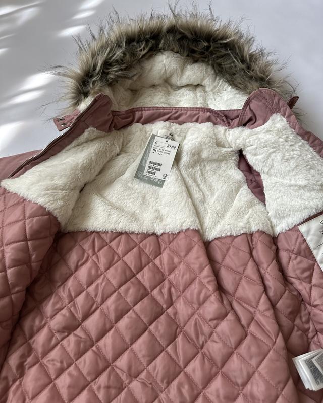 Дуже класна тепленька куртка на дівчинку H&M. Непродуваємий верх тканини, мʼяка хутряна підкладка на капюшоні та на куртці. Рукавчики на манжеті. Є куліска на поясі. Накладні глибокі кармани. Капюшон щільно прилягає до обличчя, можна його відстебнути за потребою. Камера не передає чудовий колір😔 Довжина рукава від плеча 41см Довжина по спинці від капюшона 57см ПОГ 38см