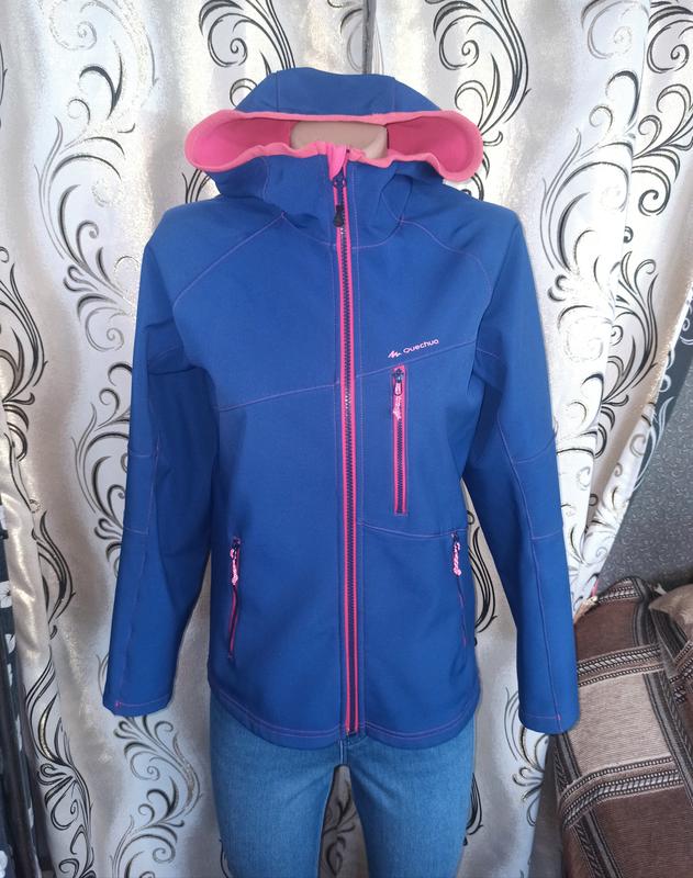 Куртка softshell софтшелл на флісі Decathlon Застібка - блискавка. Має три кишені. Розмір 14 років. Підійде на S/M. Заміри: - напівобхват грудей 48 см, - напівобхват талії 45 см, - напівобхват понизу 48 см, - довжина рукава від горловини 69 см, - довжина 62 см. У хорошому стані. На капюшоні знизу є невелика плямка (фото 7 )