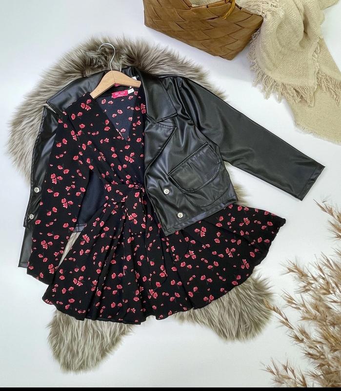 Модный комплект для девочки ир Куртка и воздушное платье ткань супер-софт и эко-кожа платье- на запах, в талии есть резиночка, поясок в комплекте куртка на кнопках без подкладки есть карман смотрится очень нежно, ткань приятная к телу рост/длин.куртки/пог/рукав от горловины/длинны/пог/рукав от горловины Похибка +-2см 140/42/42/58/68/37/55-1шт 146/45/43/61/72/38/58-1шт