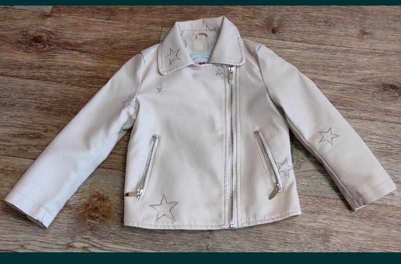 Косуха кожзам, колір бежевий, трішки камера передала більш світліший колір, в ідеальному стані, без дефектів, майже нова, вдягали 2 рази, на бірці розім 92-98, по факту буде від 3 до 5 років, в залежності від дитини