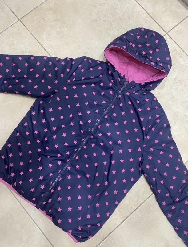 Очень теплая курточка фирмы George. На 152-158 см приблизно . Полностью как на фото. Двусторонняя. Синяя сторона в идеальном состоянии, есть карманы и карюшон, застежка молния. на розовой стороне куртки есть небольшие пятна, на 6 фото видно, возможно можно значительно вывести пятно...но сильно не видно ее и можно носить другой стороной.