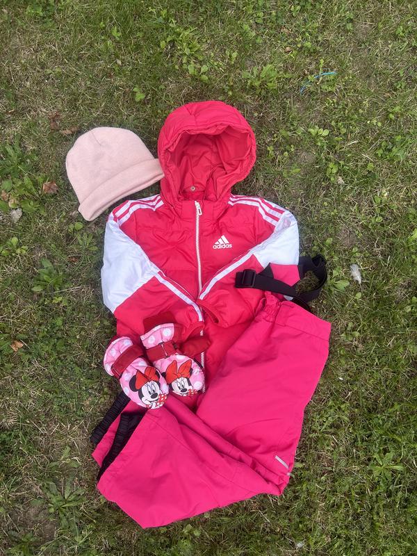 Куртка Adidas на пуху(рожева),без флісу.капюшон знімається.Штани Lupilu на мембрані(3000). З снігозахистом.Рукавички та шапка в подарунок.Є фото на дитині.Капюшон на кнопках. В штанах внизу є снігозахист(резинка на взуття),шлейки регулюються,один карман на замочку. Не важкий набір.Підійде до -10. З піддьовою(з термо білизною) можливо до -20. Підійде на зріст від 110 см до 116 см. Заміри: Куртка: Рукав від плеча 41.5 см, Ширина під руками 38 Довжина по спині 52.5 см Плечі 33.5 см Штани: Довжина 68см, Крок 47 Ширина колоші внизу 19 см Талія 29 см(резинка тягнеться до 34 см)
