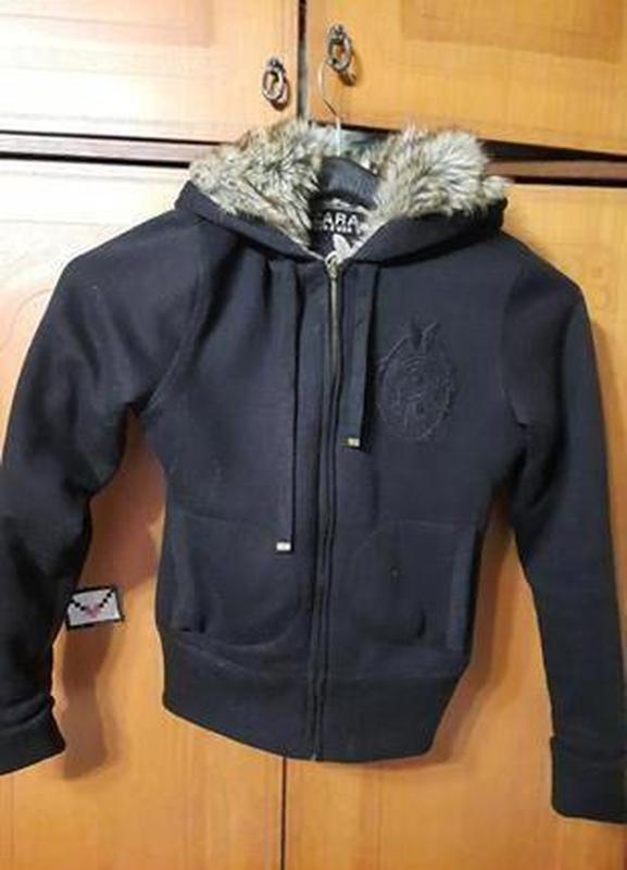 Тепла куртка з теплим капюшоном від фірми ZARA із замком на 2 сторони. Верхній матеріал трикотаж, а всередині штучне хутро. Рукави без хутра. Виміри ПОГ(напівобхват груд, під пахвами) 43см ШП(ширина плечей, між рукавами у найвужчому місці) 32см Довжина виробу (без каптура по спинці) 53см Довжина рукава 67см разом з манжеткою (можна підвернути)
